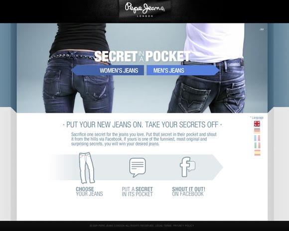 En Secret in a Pocket los usuarios pueden ver la galería denim de Pepe Jeans, y elegir el pantalón que más le guste. Ahora bien, si quieren llevárselo por la patilla antes tendrán que hacer un pequeño esfuerzo, desvelar uno de sus secretos más ocultos a todos sus amigos de Facebook. No es poco, ¿te atreves?