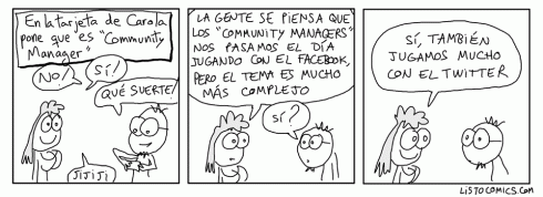 Cómo evitarlo: Separa intervalos de tiempo para comunicarte con tus amigos. Por más grande que es la comunidad, tienes que conseguir el tiempo para poder trabajar. Si pensabas que ser community manager era estar tuiteando y facebookeando todo el tiempo, mejor que vayas preparando tu caja con tus pertenencias porque no creo que vayas a durar mucho en el puesto. El community manager tiene muchas más responsabilidades que aprenderás con el tiempo.